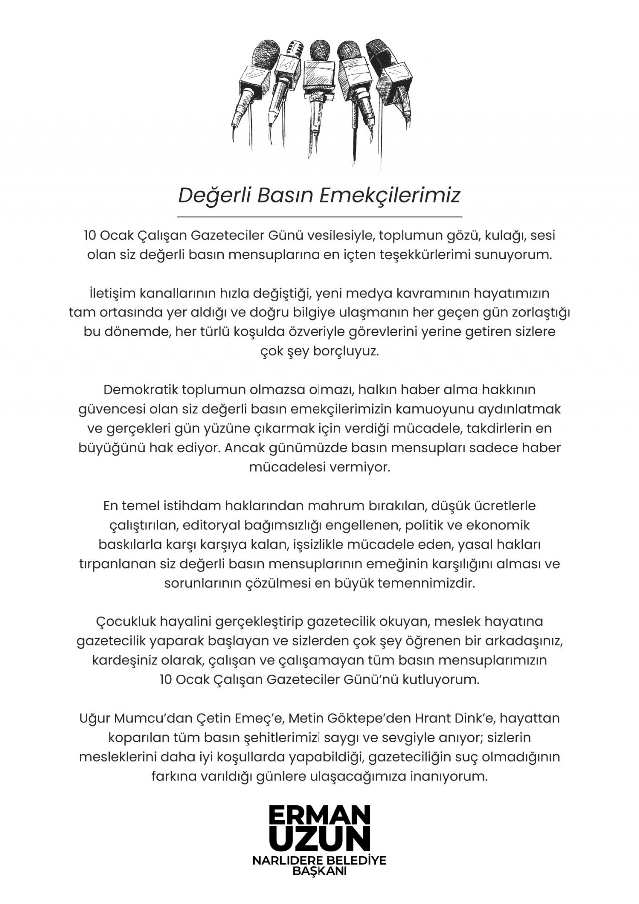 Uğur Mumcu’dan Çetin Emeç’e, Metin Göktepe’den Hrant Dink’e, hayattan koparılan basın şehitlerimizi saygı ve sevgiyle anıyor; sizlerin mesleklerini daha iyi koşullarda yapabildiği, gazeteciliğin suç olmadığının farkına varıldığı günlere ulaşacağımıza inanıyorum.”