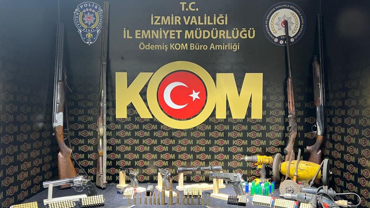 İzmir Emniyet Müdürlüğü Organize Suçlarla Mücadele Şube Müdürlüğü, Ödemiş Organize Büro Amirliği ve İstihbarat Şube Müdürlüğü ekipleri, yasa dışı silah ticareti yaptığı öğrenilen S.S.’nin 2 evine operasyon düzenledi. Evlerde yapılan aramalarda; 2 uçaksavar mermisi, 4 tüfek, 4 tabanca, 14 AK 47 fişeği, 223 tabanca fişeği, 2 muşta, çok sayıda bıçak ve silah parçası ile namlu ucu açmaya yarayan çok sayıda çeşitli atölye malzemesi ele geçirildi. Gözaltına alınan S.S., çıkarıldığı mahkemece tutuklandı.