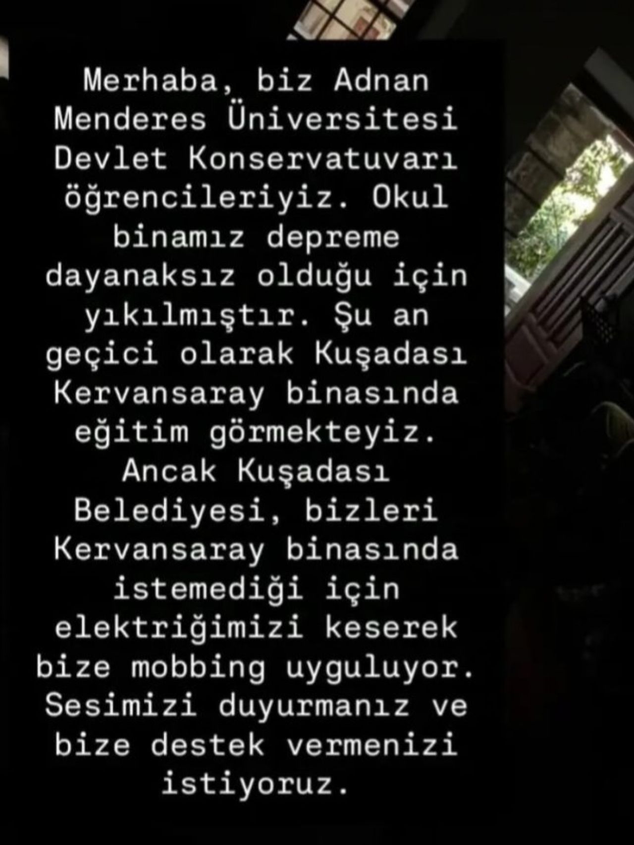 Uygulama öğrencilerin sosyal medya paylaşımları ile kamuoyunun gündemine geldi. Öğrenciler sosyal medyadan paylaştıkları mesajda şu bilgileri verdiler; "Merhaba, biz Adnan Menderes Üniversitesi Devlet Konservatuvarı öğrencileriyiz. Okul binamız depreme dayanıksız olduğu için yıkılmıştır. Şu an geçici olarak Kuşadası Kervansaray binasında eğitim görmekteyiz. Ancak, Kuşadası Belediyesi bizleri Kervansaray binasında istemediği için elektriğimizi keserek bize mobbing uyguluyor. Sesimizi duyurmanız ve bize destek vermenizi istiyoruz."