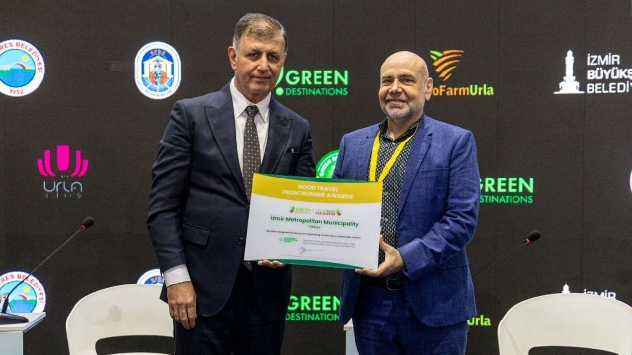 İzmir'deki projelerin hayata geçmesinde öncülük ve liderlik yapan İzmir Büyükşehir Belediye Başkanı Dr. Cemil Tugay, Green Destinations Bölge Direktörü Iyad Kayalı’nın elinden sertifikasını aldı.