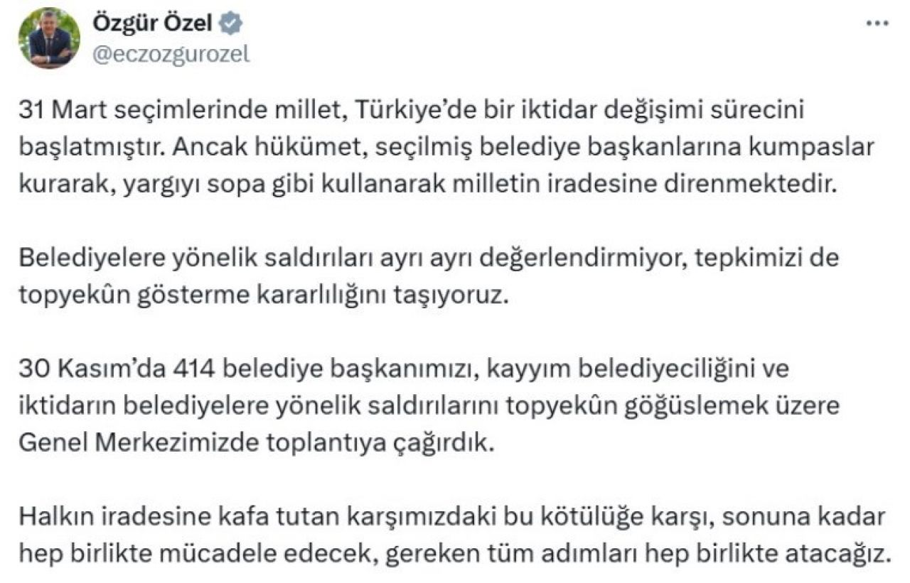 CHP lideri Özel, partisinin 30 Kasım'da düzenleyeceği toplantı hakkında yaptığı açıklamada, hükümetin seçilmiş belediye başkanlarını görevden alma girişimlerini ve kayyum uygulamalarını kınadı. Özel, partisinin 414 belediye başkanını kayyum yönetimleri ve hükümetin baskılarına karşı ortak bir duruş sergilemek üzere Genel Merkezde toplayacaklarını ifade etti ve şu ifadeleri kaydetti: