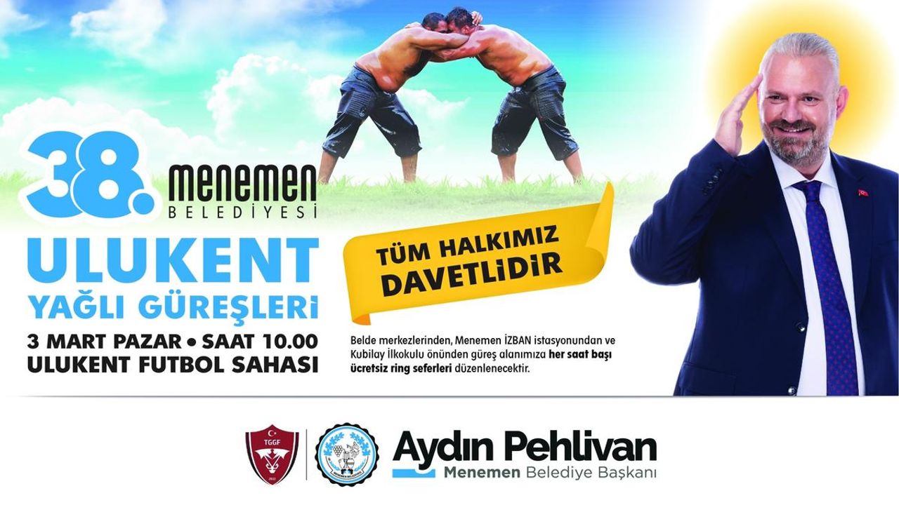 Menemen Belediye Başkanı Aydın Pehlivan, hemşehrilerini önümüzdeki Pazar günü düzenleyecekleri 38. Ulukent Yağlı Güreşlerine davet etti. Türk kültüründe büyük önemi bulunan ata sporu yağlı güreşleri yaşatmak adına Menemen’de ilk defa bu kadar büyük bir organizasyon gerçekleştireceklerini ifade eden Pehlivan, “Ülkemizin en ünlü pehlivanları Menemen’imizde kıyasıya mücadele edecek. Gün boyu sürecek etkinliğimizde heyecanlı müsabakalar izleyeceğiz. Ben tüm hemşehrilerimi, sporseverleri, güreşseverleri ve çevre illerimizden vatandaşlarımızı başpehlivanların kol bağlayacağı Ulukent’teki er meydanına davet ediyorum” dedi.
