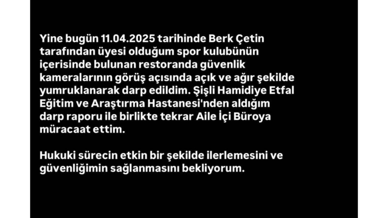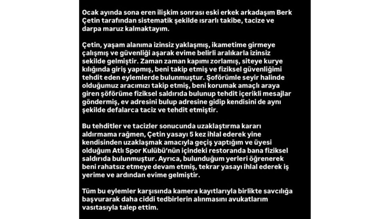 “Ocak ayında sona eren ilişkim sonrası eski erkek arkadaşım Berk Çetin tarafından sistematik şekilde ısrarlı takibe, tacize ve darpa maruz kalmaktayım.