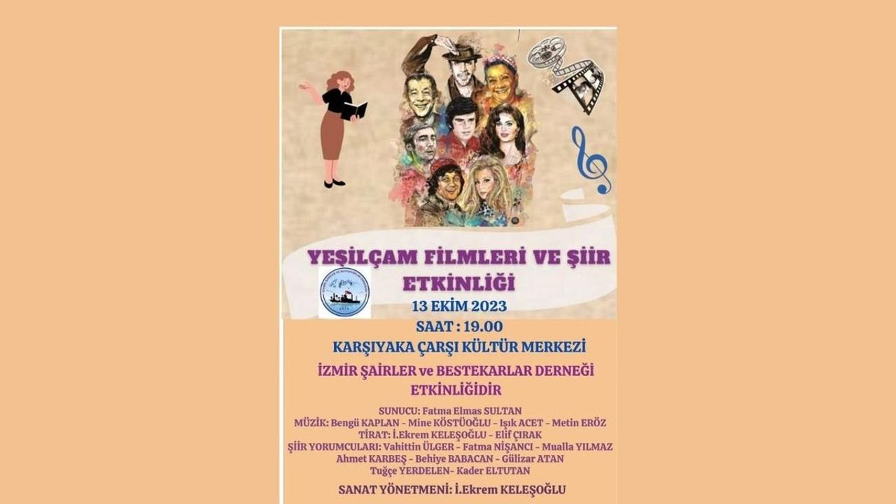 Etkinlik hakkında bilgi veren sanat yönetmeni Ekrem Keleşoğlu, “İzmir Şairler ve Bestekarlar Derneği üyeleri tarafından bu akşam 19.00’da Karşıyaka Çarşı Kültür Merkezi’nde, “Yeşilçam Filmleri ve Şiir Etkinliği” gerçekleşecek. Yeşilçam hepimizin çocukluğu, gençliği demek. Sohbetlerimiz de hala o günkü filmlere duyulan özlem gündeme geliyor. Bizler, Yeşilçam’ın unutulmaz aktörleri ile büyüdük, çocuklarımız da o dönemdeki filmleri severek izliyor. Cuma günü yapacağız etkinlik bir nevi Yeşilçam’a vefa etkinliğidir. Dernek üyeleri arkadaşlarımızın şiirleriyle renkleneceği bu gece, İzmirliler için unutulmaz olacak. İleriki dönemlerde de çok daha farklı projeler ile sanatseverlerin karşısına çıkacağız” ifadelerini kullandı.