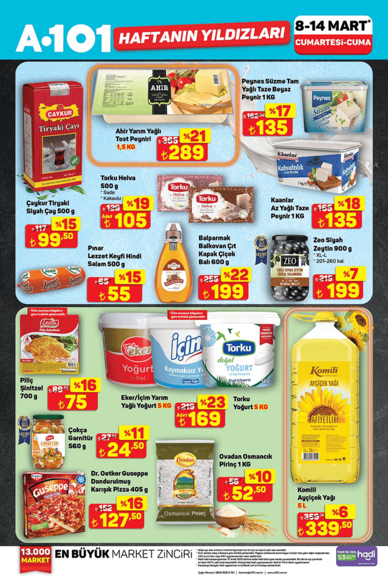 2025 Yılında marketlerden uygun fiyatlı alışveriş yapmak isteyenler indirim kampanyalarından haberdar olmak istiyorlar. A101 Market internet sayfası üzerinden yayınladığı yeni afişler ile gıda ürünlerinde geçerli indirimlerini duyurdu. Yayınlanan afişlere göre, salam, yoğurt, kaşar ve diğer birçok gıda ürününde indirim yapıldı. Söz konusu indirimler 8-14 Mart 2025 tarihleri arasında geçerli olacak.