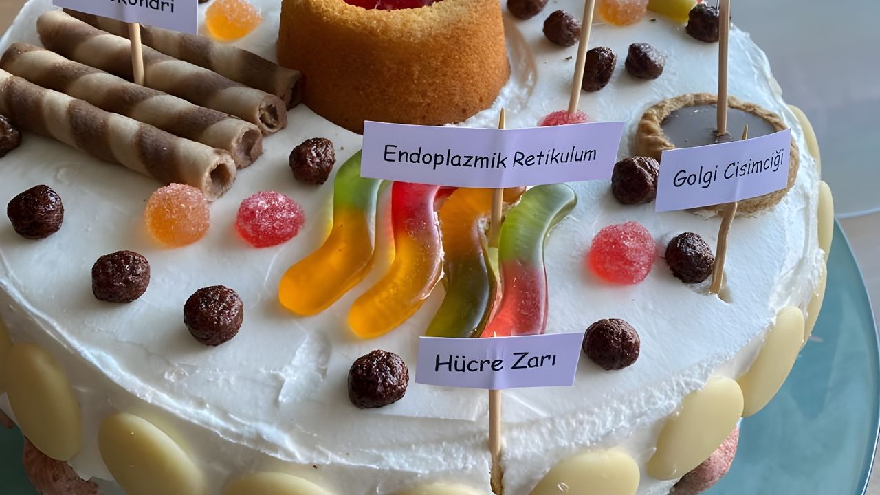Hücrenin yapısını ve organellerini daha iyi kavrayabilmek için öğrencilerimizle birlikte hayvan hücresi pasta modeli hazırladık. Pastanın kendisi hücrenin genel yapısını temsil ederken; kullanılan malzemeler hücre organellerine benzetildi. Örneğin farklı renklerde şekerlemeler mitokondriyi, kremayla yapılan bölümler sitoplazmayı, çeşitli süslemeler ise diğer organelleri temsil etti. Böylece öğrenciler, hücredeki her bir yapının görevini görsel ve somut olarak öğrenme fırsatı buldu. Bu etkinlik sayesinde öğrenciler hem iş birliği içinde çalıştı hem de hücre konusunu kalıcı şekilde öğrendi. Bilimle mutfağı bir araya getiren bu keyifli çalışma, dersimize neşe kattı. Öğrenmenin en tatlı hâli bazen gerçekten pastadan geçiyor!