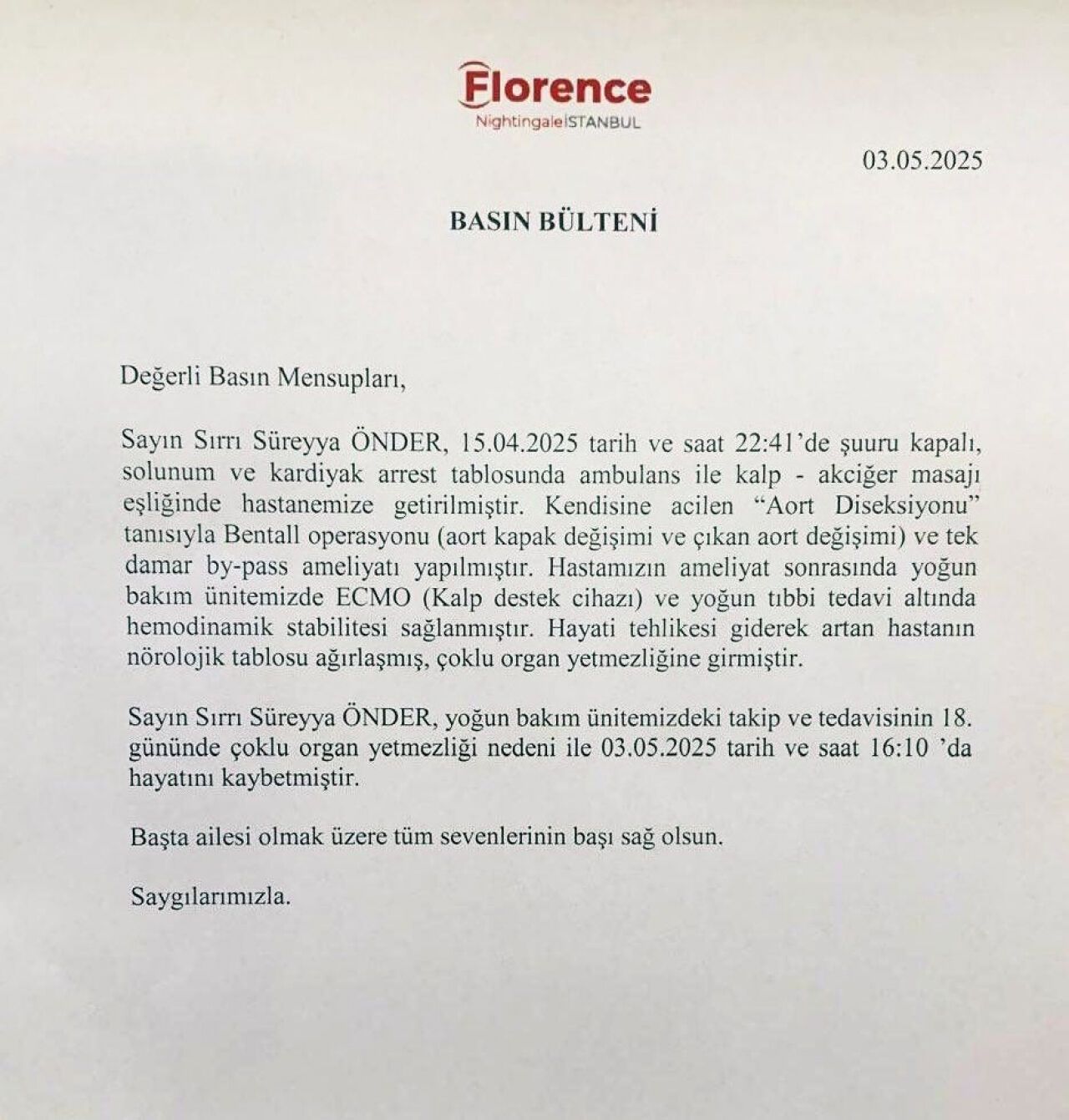 "Sayın Sırrı Süreyya ÖNDER, 15.04.2025 tarih ve saat 22:41’de şuuru kapalı, solunum ve kardiyak arrest tablosunda ambulans ile kalp - akciğer masajı eşliğinde hastanemize getirilmiştir. Kendisine acilen “Aort Diseksiyonu” tanısıyla Bentall operasyonu (aort kapak değişimi ve çıkan aort değişimi) ve tek damar by-pass ameliyatı yapılmıştır. Hastamızın ameliyat sonrasında yoğun bakım ünitemizde ECMO (Kalp destek cihazı) ve yoğun tübik tedavi altında hemodinamik stabilitesi sağlanmıştır. Hayati tehlikesi giderek artan hastanın nörolojik tablosu ağırlaşmış, çoklu organ yetmezliğine girmiştir.