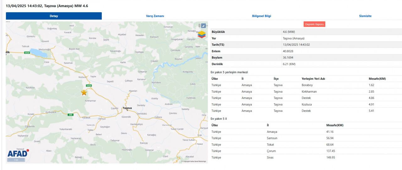 İlk belirlemelere göre depremin merkez üssü Amasya, büyüklüğü ise 4.6 olarak ölçüldü. AFAD ise depremin büyüklüğüne 4.6 olarak açıkladı. Saat 17.43'te meydana gelen depreme ilişkin saha çalışmaları sürüyor. İlk etapta herhangi bir hasar kaydı bildirilmedi.