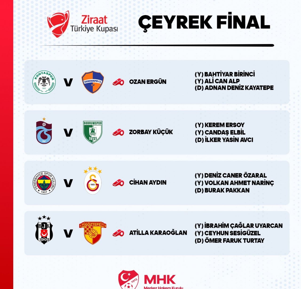 Ziraat Türkiye Kupası çeyrek finalinde Fenerbahçe ile Galatasaray arasında oynanacak dev derbinin hakemi belli oldu. Türkiye Futbol Federasyonu Merkez Hakem Kurulu, maçın yönetileceği hakemi açıkladı.