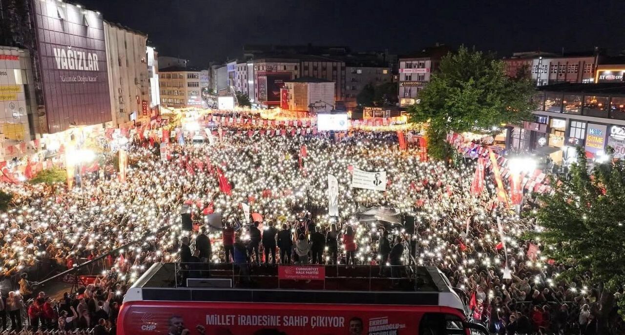 Bugün Ekrem Başkan’la Silivri’de sohbet ettik. Sarıldık, ayrılırken ‘Bir diyeceğin var mı Başkan?’ dedim. Dedi ki, ‘Hiç merak etmeyin. Esenler bu akşam bütün ezberleri bozacak. Ben oradaymışım gibi ekran başından sarılıyorum Esenler’e.’ Ekrem Başkan’ı seviyor muyuz? Onu özledik mi? Ona buradan bir büyük selamı yollamaya hazır mıyız? ‘Yiğidim Aslanım’ gelsin mi? Haydi bakalım. Buradan Silivri’ye telefonların ışıklarıyla, drone tepede. Ekrem Başkan’ın selamını aldı Esenler, başı gözü üstüne. Buradan Ekrem Başkan’a selam olsun.”
