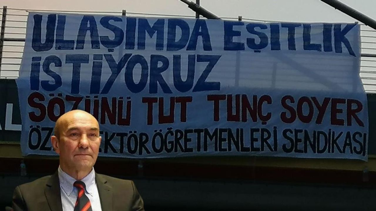 Turgay Kılıç/ YENİ İZMİR-Özel kurum öğretmenleri, Güzelyalı sahilinde bulunan Göztepe Köprüsü’ne astıkları Özel Sektör Öğretmenleri Sendikası imzalı pankartla “Ulaşımda eşitlik istiyoruz. Sözünü Tut Tunç Soyer…” diyerek, Tunç Soyer’e seslenmişti. 14 Ağustos 2023 tarihinde Özel Sektör Öğretmenleri Sendikası temsilcileri, İzmir Büyükşehir Belediye Başkanı Tunç Soyer ile görüşmüş, Başkan Soyer ise bu indirimi yapmayı istediklerini, kendilerine gereken yasal dayanakların sunulması ve zaten açık olan bu hakkın belgelemesi durumunda indirimli ulaşım kartı hakkına ilişkin sürecin olumlu ilerleyeceği sözünü vermişti.