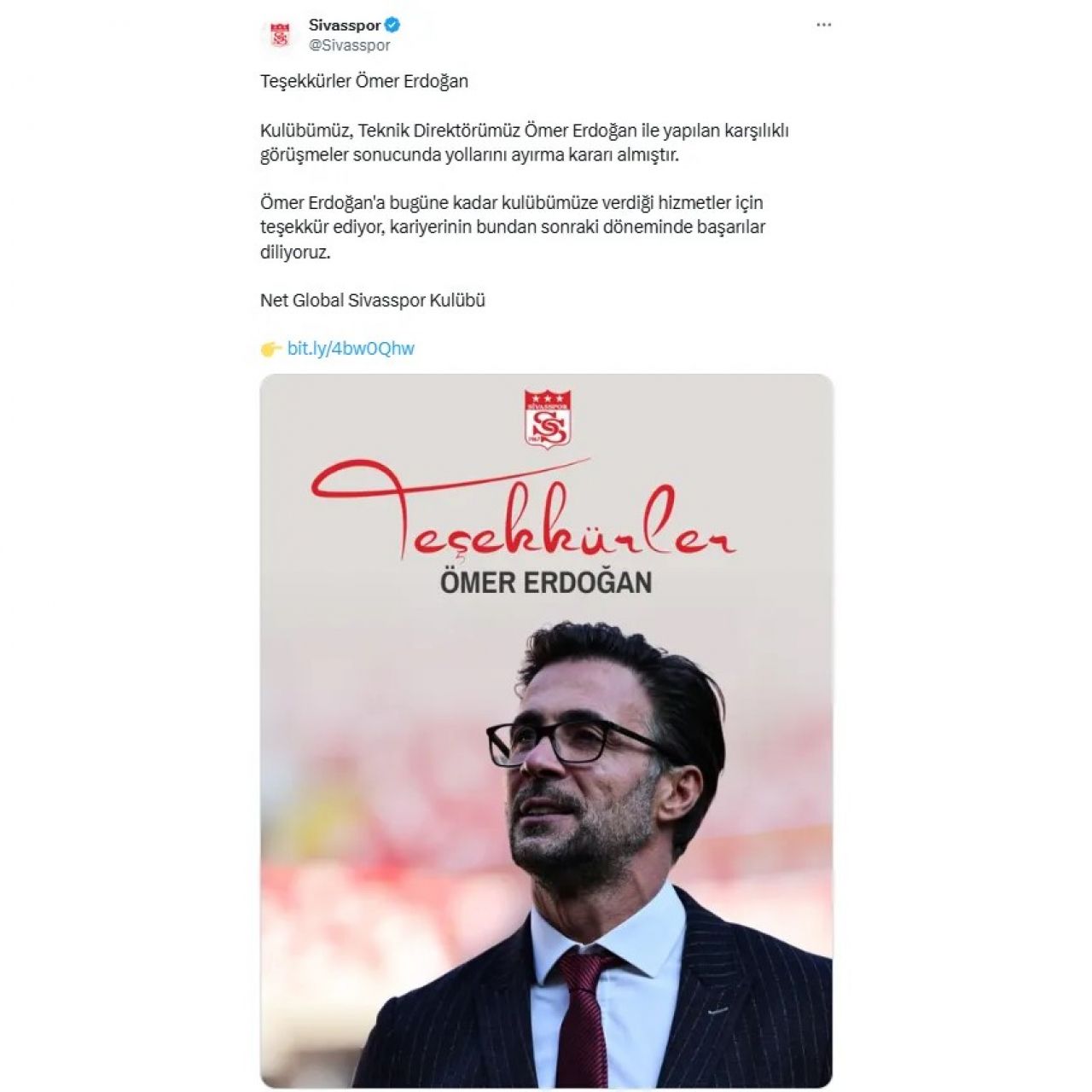 "Teşekkürler Ömer Erdoğan! Kulübümüz, Teknik Direktörümüz Ömer Erdoğan ile yapılan karşılıklı görüşmeler sonucunda yollarını ayırma kararı almıştır. Ömer Erdoğan'a bugüne kadar kulübümüze verdiği hizmetler için teşekkür ediyor, kariyerinin bundan sonraki döneminde başarılar diliyoruz."