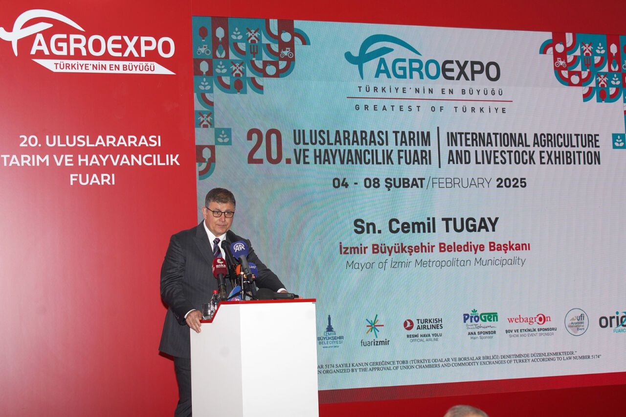 Fuarın açılışında konuşan İzmir Büyükşehir Belediye Başkanı Dr. Cemil Tugay, AGROEXPO'nun büyümesi ve gelişmesi için belediye olarak gereken desteği sürdüreceklerini belirterek, tarım ve hayvancılığın gelişmesi için kette yaptıkları çalışmaları aktardı. Üreticinin her zaman yanında olduklarının altını bir kez daha çizen Başkan Tugay, “Türkiye'de hayvansal üretimde İzmir ikinci, bitkisel tarımda da üçüncü sırada üretim miktarı açısından. Yeni kurulan tarıma dayalı organize sanayi bölgelerinin de üretime başlamasıyla daha da sıçrama olacak. Bu gelişimi desteklediğimizi, katkı vermek için her zaman yanlarında olduğumuzu ifade etmek isterim. İzmir'in bütün kurumlarıyla tarıma destek vermesi, tarımda doğru çalışmaların yapılması için emek harcaması gerekir. İzmir Büyükşehir Belediyesi uzun yıllardır tarıma; kooperatifler üzerinden, yerleşim birimleri üzerinden elinden gelen desteği veriyor. Geçen yıl 49 binden fazla üreticiye 250 milyondan fazla destek verdik. Bir kısmı ihtiyaç duyulan tohum, fidan, bazı hayvansal ürünler gibi kalemlerde oldu. Bir kısım da ürün alımıyla oldu. İzmir'de önemli süt üretimi var. Yaptığımız alımlarla üreticiye destek verdik. Bu desteği daha da artıracağız” dedi.