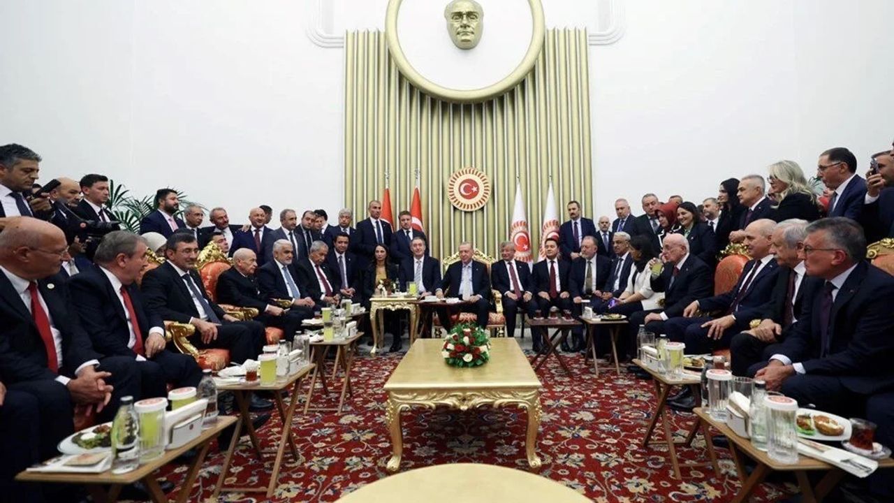 Meclis Başkanı Numan Kurtulmuş’un ev sahipliğinde gerçekleşen resepsiyona, Cumhurbaşkanı Erdoğan, Devlet Bahçeli, DEM Parti Eş Genel Başkanları Tülay Hatimoğulları ve Tuncer Bakırhan ile bakanlar katıldı. Ayrıca, Meclis’te grubu bulunan siyasi partilerin liderleri de resepsiyona iştirak etti.