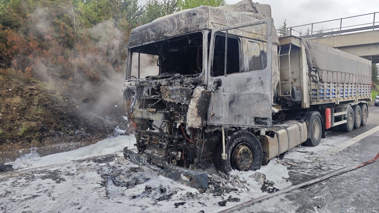 Bolu’da sabah saatlerinde meydana gelen olayda, TEM Otoyolu’nun Akçakavak köyü mevkisinde seyir halindeki bir tır, beklenmedik şekilde yanmaya başladı. Yangının nedeni ise sürüş esnasında patlayan sağ ön tekerlek oldu.