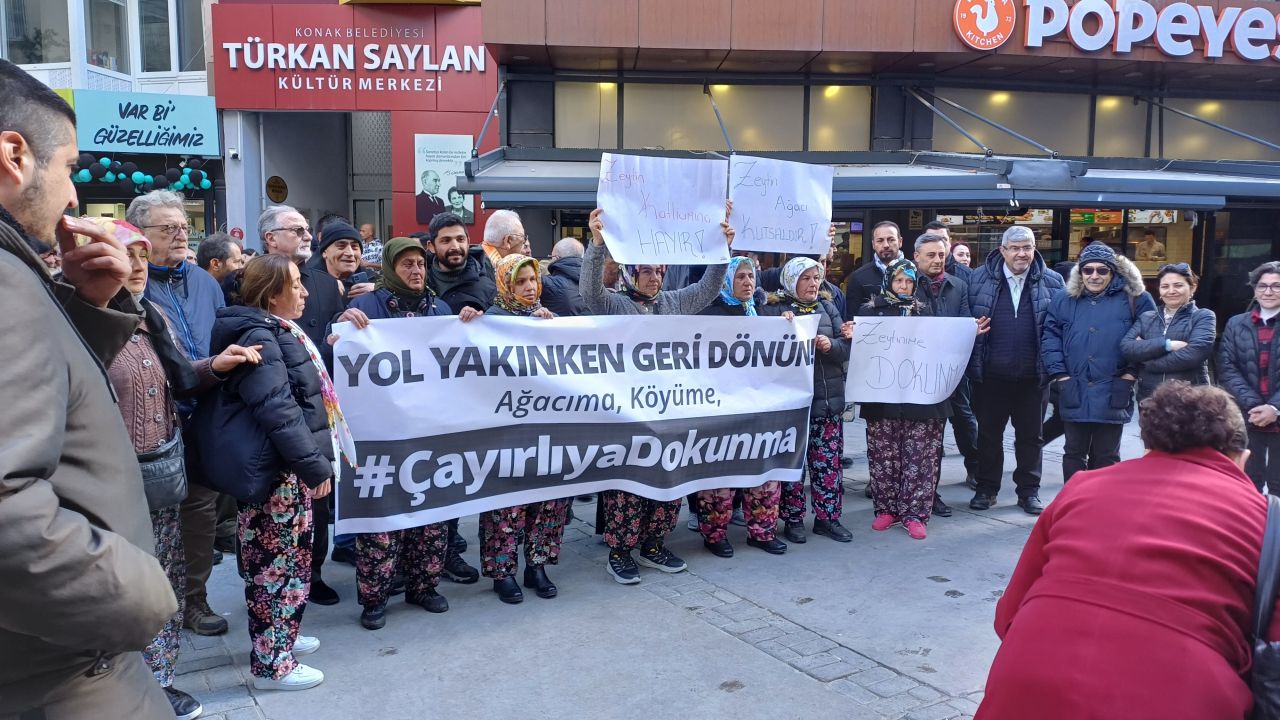 Duble yol projesi nedeniyle zeytinlik ve inciliklerini kaybetme tehlikesiyle karşı karşıya kalan Tire'nin Çayırlı köylüleri, direnişlerini Alsancak Kıbrıs Şehitleri Caddesi'ne taşıdı.
