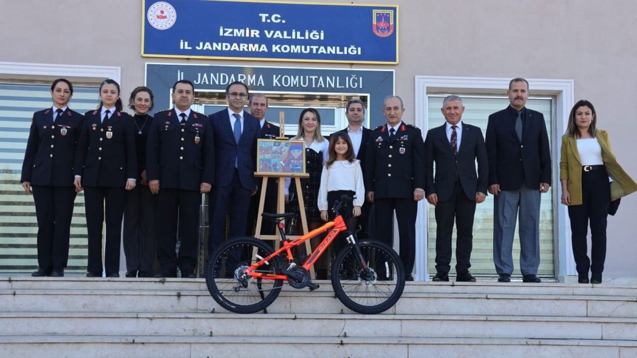 Resim yarışmasında Türkiye birincisi olan minik Eylül’e bisiklet, boya kalemi ve voleybol topu hediye edilirken adına düzenlenen plaket ve sertifika takdim edildi. İzmir İl Milli Eğitim Müdürü Dr. Ömer Yahşi, dereceye giren öğrenciyi eserinde “Cumhuriyet, Güvenlik ve Jandarma” temasını etkileyici bir şekilde işlediği için tebrik etti. Ödüllerini; İl Jandarma Komutanı Tuğgeneral Osman Kılıç ve İl Milli Eğitim Müdürü Dr. Ömer Yahşi’nin elinden alan Eylül’ün mutluluğu gözlerinden okunuyordu.