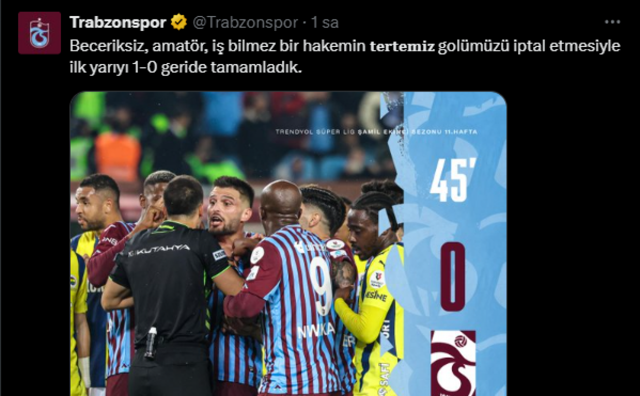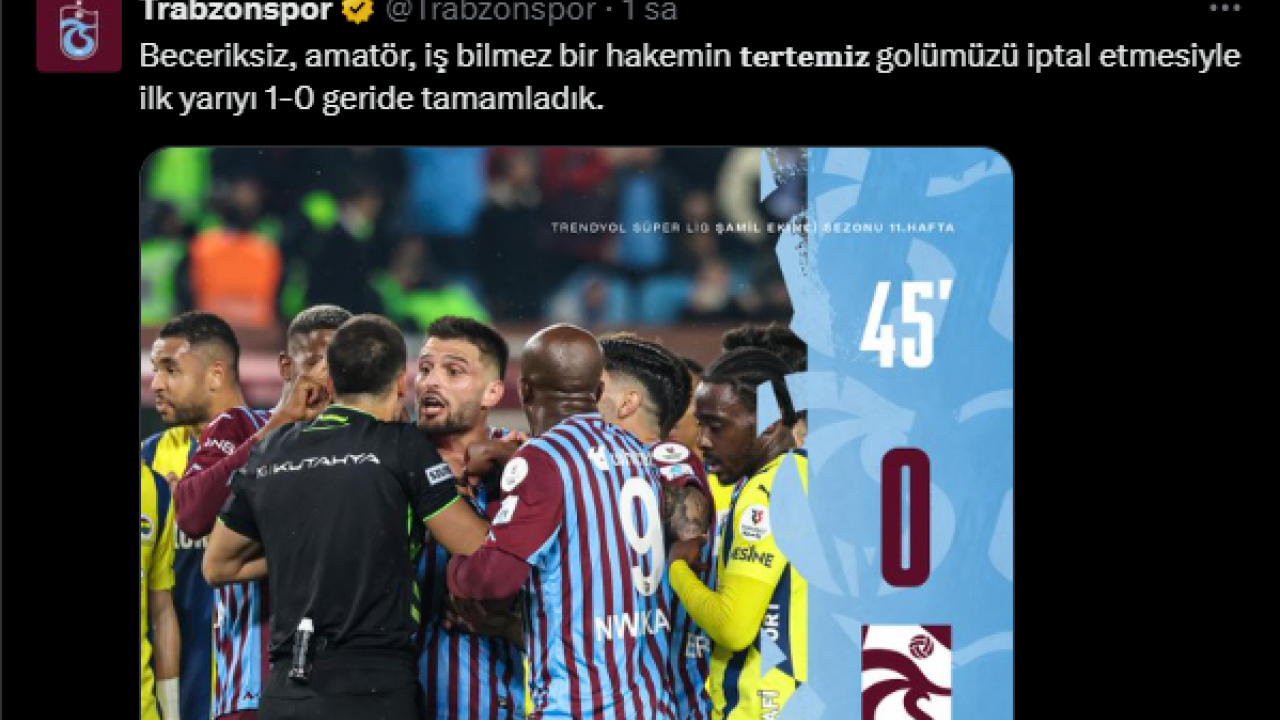 Fenerbahçe karşısında devre arasına 1-0 yenik giren Trabzonspor, hakem yönetimine yönelik tepkisini sosyal medya üzerinden dile getirdi. Trabzonspor'un paylaşımında, "Beceriksiz, amatör, iş bilmez bir hakemin tertemiz golümüzü iptal etmesiyle ilk yarıyı 1-0 geride tamamladık" ifadeleri kullanıldı. Ayrıca, iptal edilen Okay Yokuşlu'nun golünün videosunu da paylaşan Trabzonspor, "Bravo" ifadesiyle hakeme olan tepkisini bir kez daha vurguladı.