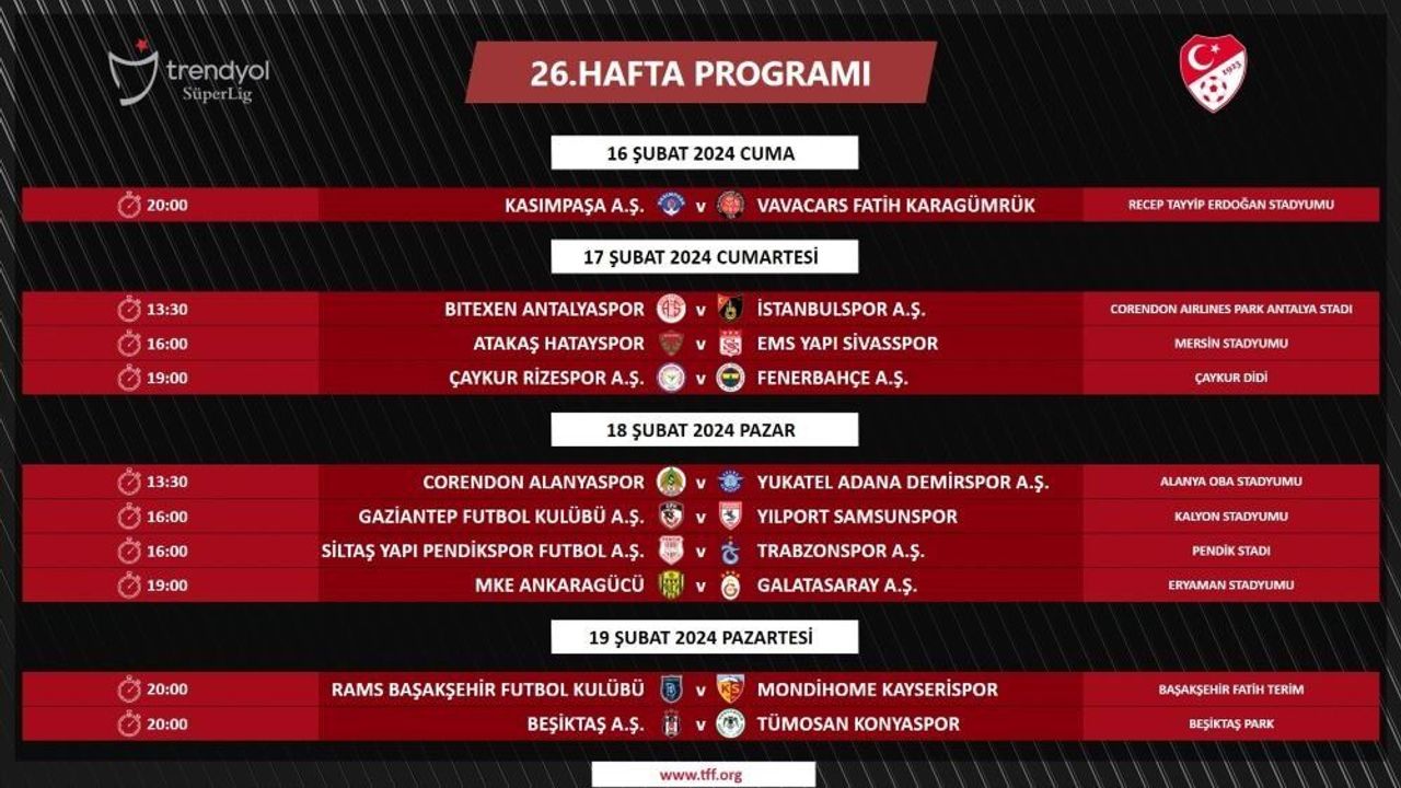 Türkiye Futbol Federasyonu’nun (TFF) resmi internet sitesinden yapılan açıklamada, Süper Lig’in 26. haftasında oynanacak müsabakaların günleri belli oldu. 16-19 Şubat tarihleri arasında yapılacak karşılaşmaların programı şöyle: