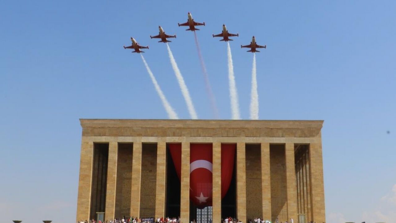 Türk Hava Kuvvetleri'nin akrobasi timi Türk Yıldızları, 30 Ağustos Zafer Bayramı kapsamında Anıtkabir semalarında saygı uçuşu gerçekleştirdi.