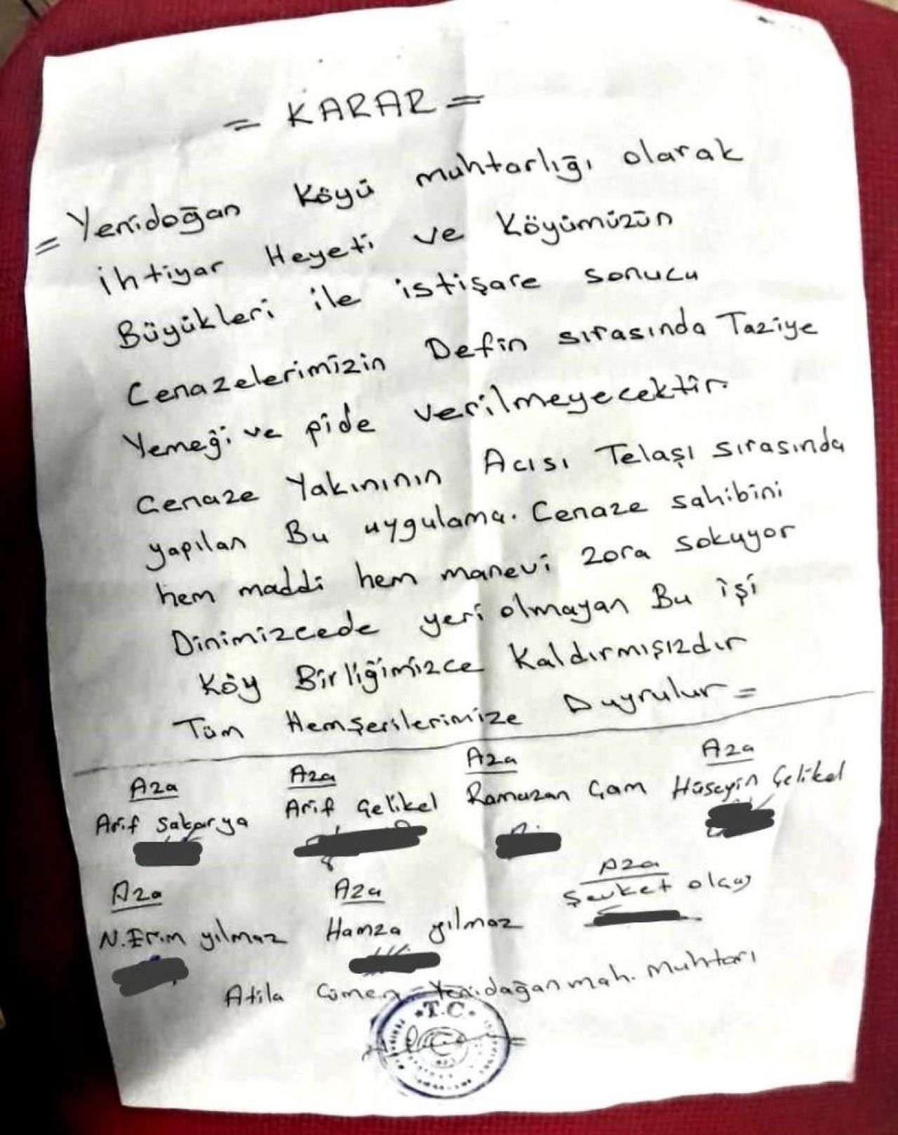 Muhtar Atilla Çimen, Muhtar Çimen, cenaze sahiplerinin maddi ve manevi açıdan zor duruma düşmemesi amacıyla bu kararın alındığını açıkladı. Cenaze sahiplerinin, acılarını yaşarken taziye için gelen misafirlere yemek hazırlama telaşıyla daha fazla zorlanmamalarını sağlamak amacıyla böyle bir adım atıldığını söyledi. Muhtar Çimen,"Yenidoğan Mahallesi muhtarı olarak görev yapmaktayım. İnsanlar cenazesinde acısını yaşamadan taziyeye gelen misafirlere yemek dağıtma telaşına düşmeleri acılarının arasında bu tür olaylarla uğraşmaları bizleri rahatsız etmektedir. Farkındalık oluşturmak amacıyla köyümüzde cenazelerde yemek dağıtmama kararını aldık. Tüm mahallelerimizden de aynı kararı bekliyoruz" diye konuştu.