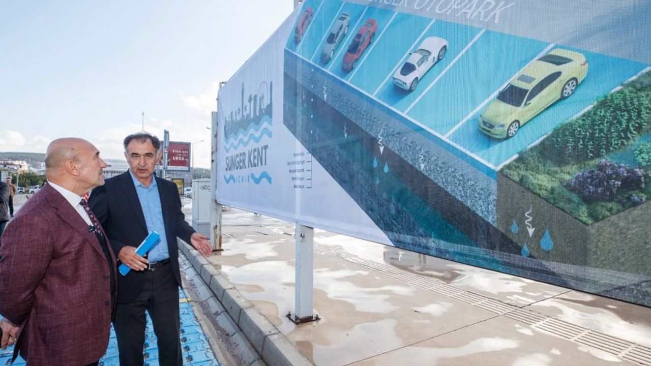 Küresel iklim krizi ve kuraklıkla mücadele için Sünger Kent İzmir projesini hayata geçiren İzmir Büyükşehir Belediyesi, çalışmaya yeni bir halka daha ekledi. Gaziemir’de İZELMAN’a ait Sakarya Otoparkı, sünger otoparka dönüştürüldü. Otoparkı inceleyen ve bilgi alan İzmir Büyükşehir Belediye Başkanı Tunç Soyer, “Türkiye’nin ilk sünger otoparkına hoş geldiniz” dedi. Burasının da ilk bakışta Türkiye’nin her yerinde görülen otoparklardan biri gibi algılandığını ifade eden Başkan Tunç Soyer, “Ama öyle değil. Bu otopark Türkiye’deki bütün otoparklardan farklı. Zeminin altına döşenen geçirimli malzeme ile suyu zemin altında toplayıp, biriktirme imkanı veriyor. Yağmur suyu kanallarına gidip zayi olan suyu bu otoparkta zayi etmiyoruz. Kaybolmasına izin vermiyoruz. Yağmur suyu olarak Körfez’e akmasına izin vermiyoruz. Burada biriktiriyoruz. Bu da önemli bir tasarruf sağlıyor” dedi.
