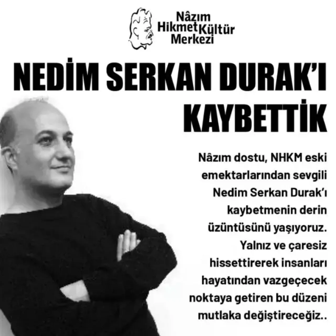 Nazım Hikmet Kültür Merkezi'nin X hesabından yapılan paylaşımda ise şu ifadelere yer verildi: Nedim Serkan Durak'ı kaybettik. Nâzım dostu, NHKM eski emektarlarından sevgili Nedim Serkan Durak'ı kaybetmenin derin üzüntüsünü yaşıyoruz. Yalnız ve çaresiz hissettirerek insanları hayatından vazgeçecek noktaya getiren bu düzeni mutlaka değiştireceğiz.