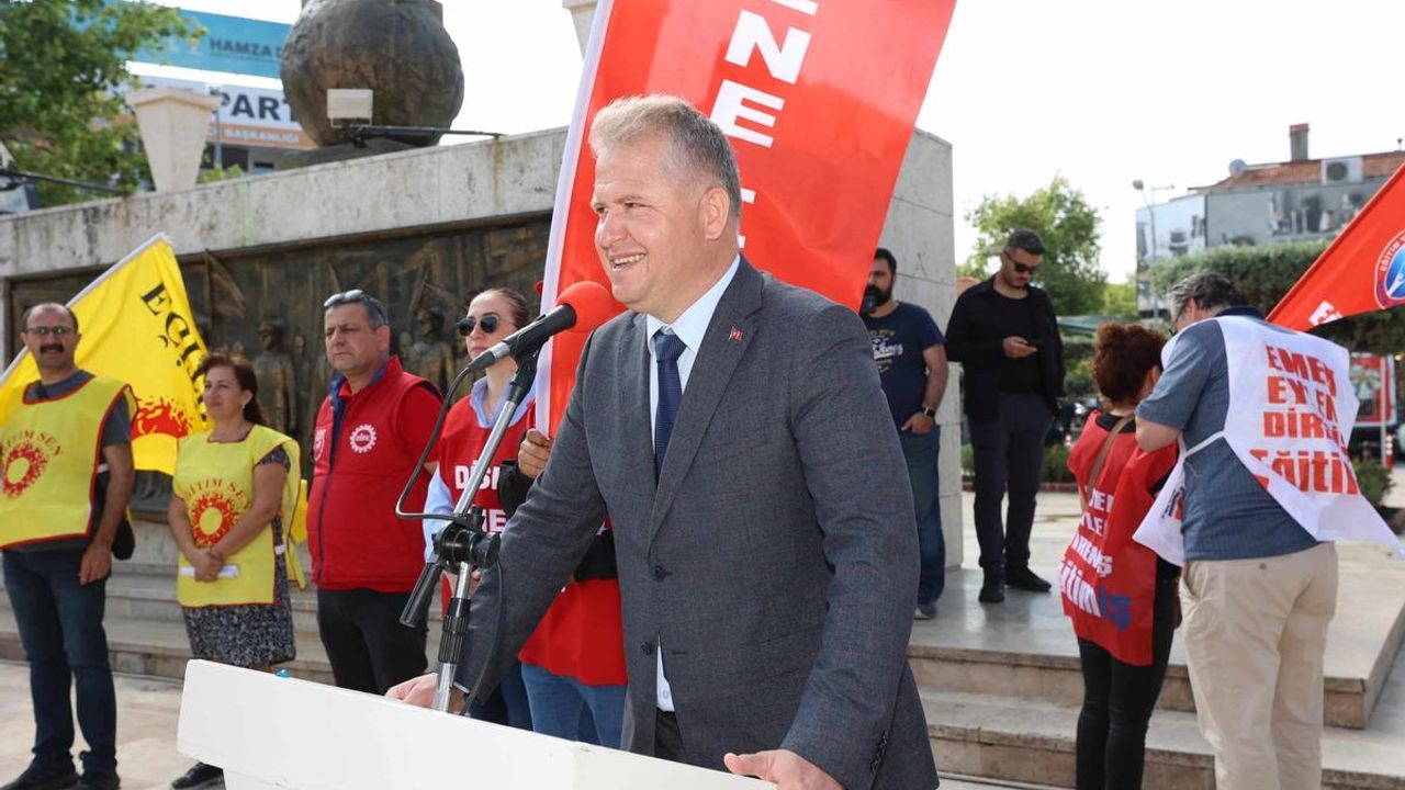 DİSK 4 No’lu Şube Başkanı Aydın Tekin, 2019 yılından sonra Urla Meydanında tekrardan 1 Mayıs kutlaması yapmanın onurunu ve gururunu yaşadıklarını belirterek, “Bizlere bu gururu yaşatan Urla halkına ve Belediye Başkanıma Selçuk Balkan’a teşekkür ederim. 1880’li yılların başlarından bugüne 16 saatlik çalışma saatlerinin 8 saat olması için hafta tatili olması için, sağlık güvencesi hakkı için, emeklilik hakkı için, sendikalaşmak için, güvenceli çalışma hakkı için bu uğurda ikballerini ve hayatlarını kaybeden sınıf yoldaşları saygıyla anıyorum” dedi.