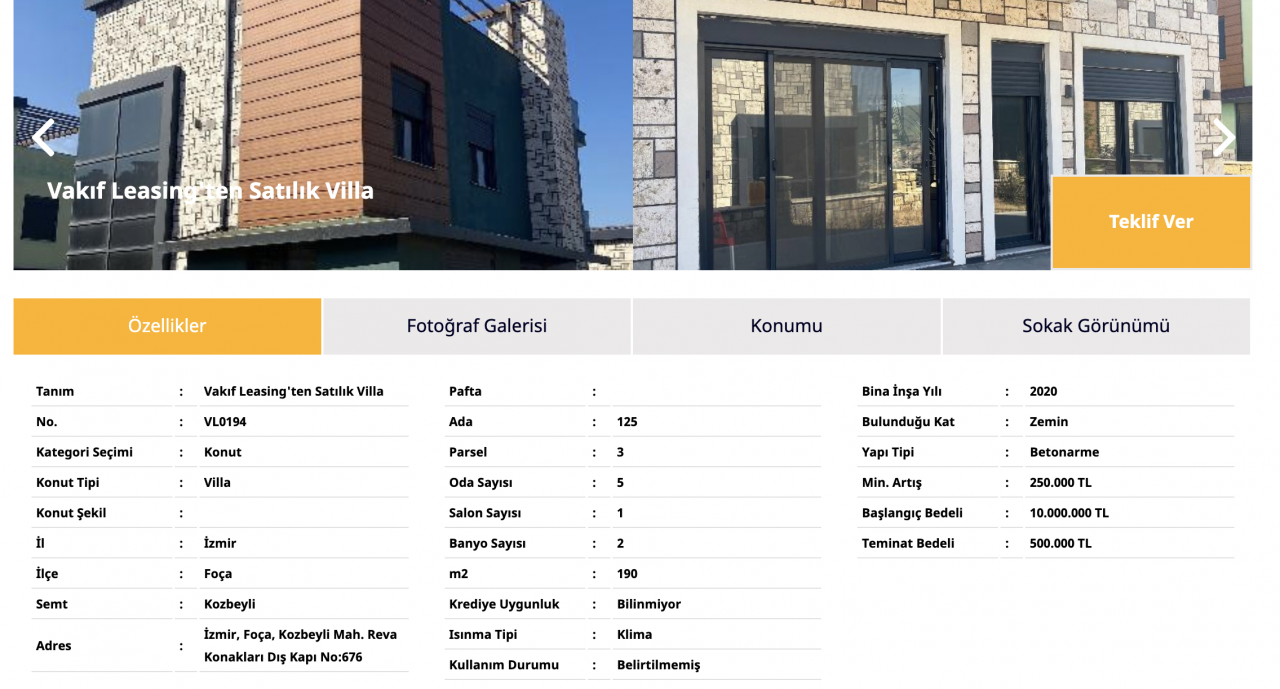 2025 Yılı içerisinde ev sahibi olmak isteyenler bankaların gayrimenkul satış ilanlarından haberdar olmak istiyor. Vakıfbank İzmir'in Foça ilçesinde villa satışı için ilana çıktı. Yayınlanan ilanda teminat miktarı 500 Bin TL olarak açıklandı. Satın almak isteyenlerin düzenlenecek ihaleye katılım sağlaması gerekiyor. Villa satışı için başlangıç miktarı ise 10 Milyon TL olarak vatandaşlara bildirildi.