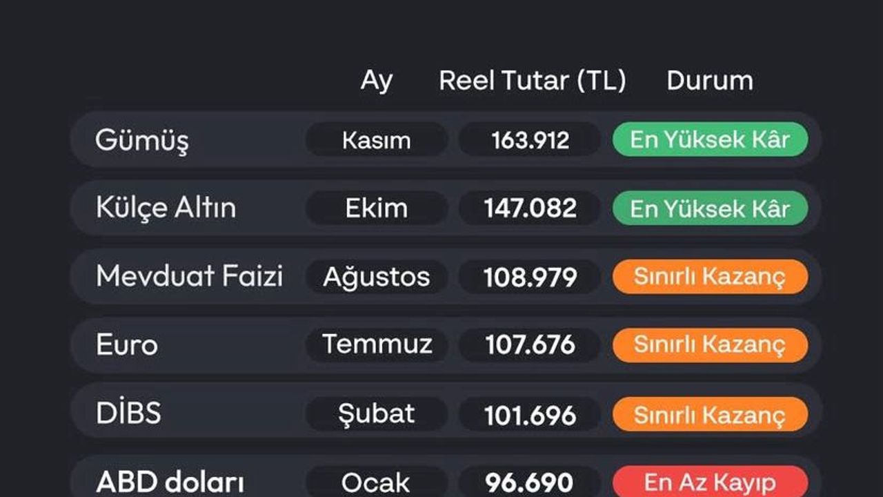 Yatırımınızı Kasım ayında gümüşe yatırmış olsaydınız, yıl sonunda paranız 163.912 TL’ye çıkacaktı. Bu, yılın en yüksek reel kazancı olarak kayıtlara geçti.