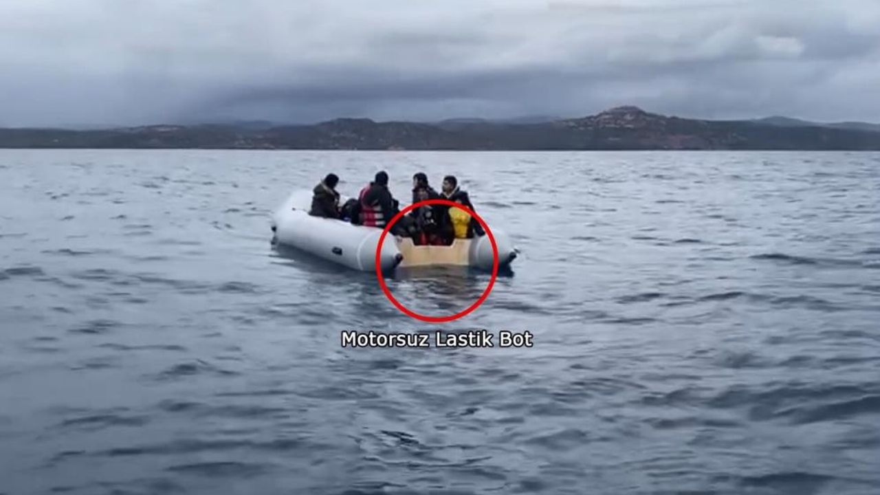 Yunan unsurları tarafından Türk karasularına geri itilerek ölüme terk edilen kaçak göçmenlerin, Sahil Güvenlik ekiplerince paylaşılan görüntülerde, kaçak göçmenlerin lastik bottaki motorunun söküldüğü ve deniz ortasında yağmur altında mahsur kaldığı görülüyor.