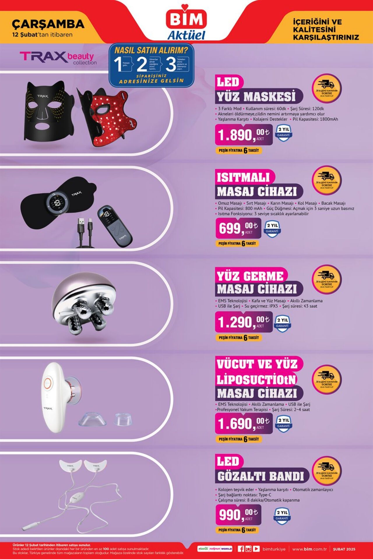 BİM Market 12 Şubat tarihli afişlerini internet sayfası üzerinden yayınlandı. Yayınlanan yeni afişlerde, yüz germe masaj cihazı ve liposuctıon masaj cihazı gibi ürünlerin 12 Şubat'ta BİM Market'te satışa çıkacağı öğrenildi.