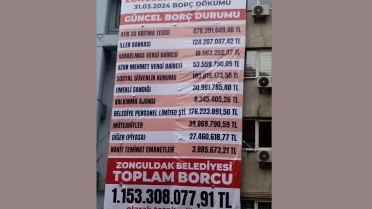CHP’li Zonguldak Belediye Belediye Başkanı Tahsin Erdem, AKP’den devralınan belediyenin borçlarını belediye binasına astığı pankartla kamuoyuna duyurdu. Erdem, “Bu mali tablo pankartı, şeffaf belediyecilik anlayışımız gereği halkımıza hesap verebilirlik ilkesi adına yapmış olduğumuz bir uygulamadır. Bu uygulama, görevde olduğum sürece belirli aralıklarla kamuoyuyla paylaşılmaya devam edecektir” dedi. CHP Zonguldak Milletvekili Deniz Yavuzyılmaz, “Uçan kuşa borç takmışlar, kara liste bırakıp gittiler’’ ifadelerini kullandı. Zonguldak Belediyesi’nin güncel borç dökümü şöyle: